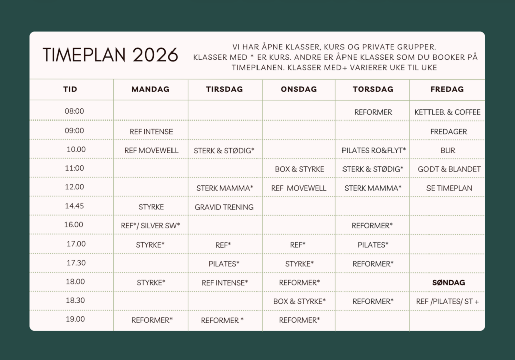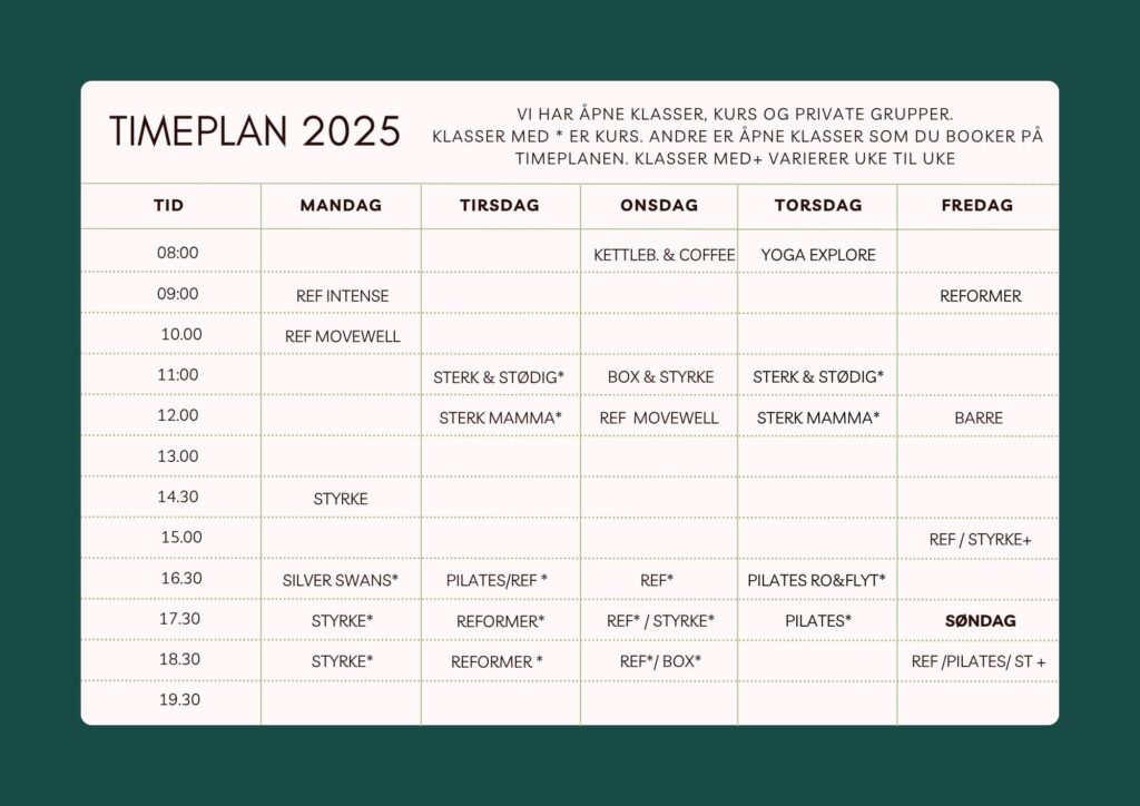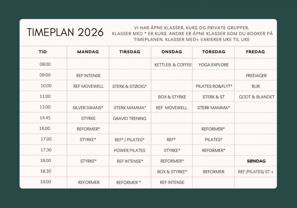 Hos oss finner du et variert tilbud, fra rolige klasser med yoga, til klasser som setter fart på både muskler og kondisjon. Fra tidlig morgen til sen kveld. Vi har åpne klasser, kurs og private gruppeer/bedrifter. Klasser kveldstid booker du som kurs. Dagtid har vi enkelte åpne klasser som du kan benytte klippekort eller drop in. Timeplan for vinter 2025 er klar og booking av kurs åpnet. Bli medlem av vår gratis CLUB HER, for å få FØRST beskjed når vi åpner for booking.